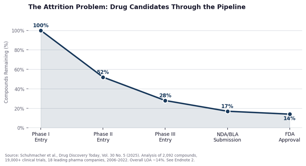 4. Norstella. "Why Are Clinical Development Success Rates Falling?" September 30, 2025. norstella.com. Based on Citeline phase transition data covering the 10-year period from 2014 to 2023. Reports average likelihood of approval from Phase I at 6.7%, described as an all-time low. Phase II remains the single largest attrition point, with only 28% of programs advancing. Note: Norstella is a commercial analytics firm; underlying data sourced from Citeline, an established pharmaceutical intelligence database used widely across the industry.